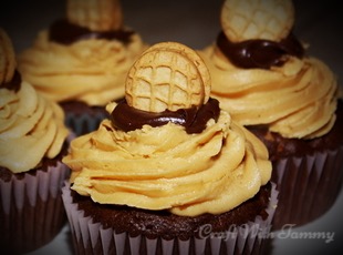Remove the cupcakes from the fridge or freezer and drizzle or make a small pool on the center top of frosting with warm chocolate ganache. Add a half of a nutter butter cookie into chocolate. Sprinkle of chopped peanuts if desired.
