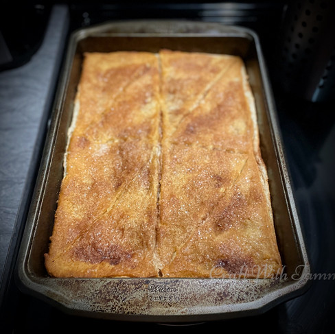 Preheat oven to 350°F with a rack in the middle of the oven. Grease a 9×13 baking pan and sprinkle 1-2 tablespoons cinnamon sugar in the bottom.