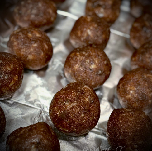 Once cake is cool enough to touch, start breaking and crumbling cake into a large mixing bowl. Add pecan frosting, marshmallow cream/fluff to crumbled cake. Mix until combined into the truffle batter.