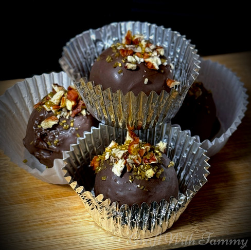 Using the remaning 1/4 cup toasted coconut and pecans, top each truffle. Repeat until all truffles are dipped and decorated. Let sit about 20 minutes until hardened.
